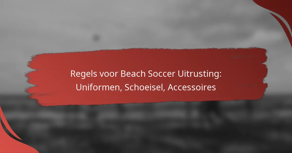Beach socceruitrusting wordt beheerst door specifieke regels die betrekking hebben op uniformen, schoeisel en accessoires om een professionele uitstraling en de veiligheid van de spelers te waarborgen. Uniformen moeten voldoen aan de voorschriften met betrekking tot ontwerp en branding, terwijl de keuze van schoeisel kan variëren tussen gespecialiseerde schoenen en blote voeten. Bovendien mogen spelers bepaalde accessoires dragen die de prestaties verbeteren, op voorwaarde dat ze voldoen aan de veiligheidsnormen om eerlijk spel te waarborgen.